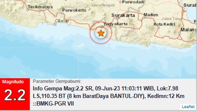 "Info Gempa Mag:2.2, 09-Jun-23 11.03.11 WIB," demikian dikutip dari akun resmi Twitter BMKG DIY @bmkgjogja, Jumat (9/6/2023).