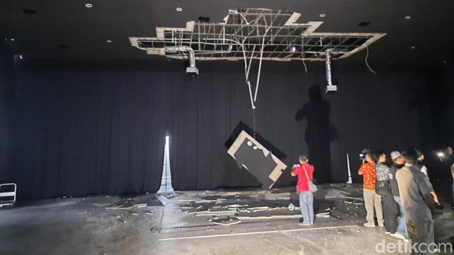Pantauan detikJateng, tampak masih ada pecahan genteng di depan gedung TBG. Selain itu, di auditorium tampak bagian atap baik di panggung dan area penonton mengalami kerusakan seperti plafon yang ambruk.