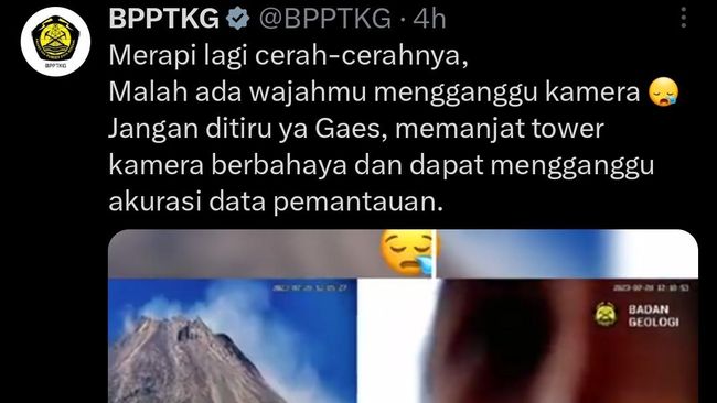 Jangan ditiru ya Gaes, memanjat tower kamera berbahaya dan dapat mengganggu akurasi data pemantauan," tulis akun resmi BPPTKG, Kamis (20/7/2023).