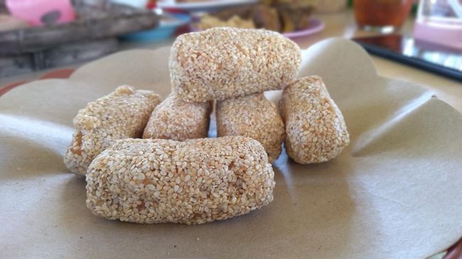"Bahan bakunya ialah tepung yang diolah menjadi kue kering berbentuk memanjang. Pada kulitnya ditaburi wijen seperti onde-onde tapi agak legit," kata Andrianto.