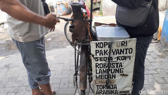 Dia berkeliling menggunakan sepeda tua yang digunakannya sejak tahun 1991. Pria yang dikenal bernama Pak Yanto ini juga selalu membawa alat penggiling kopi yang merupakan produksi Eropa.