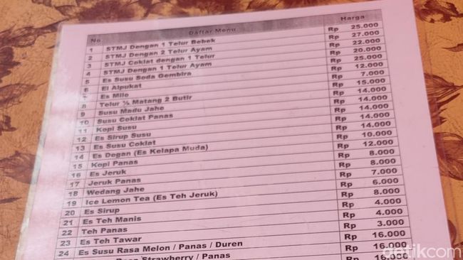 Warung itu sebenarnya lebih dikenal dengan menu roti bakar dan susu murni. Ada banyak pilihan menu susu murni di sana mulai Rp 14 ribu hingga Rp 25 ribu. Sedangkan untuk roti bakar paling murah Rp 15 ribu dan termahal Rp 30 ribu.
