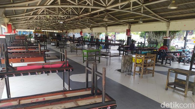 Pantauan detikJateng, Kamis (23/3/2023), suasana di pusat kuliner Tuin Van Java Alun-Alun Kota Magelang tampak lengang. Meja-meja masih tertata dengan rapi dengan kursi ditata terbalik di atasnya.