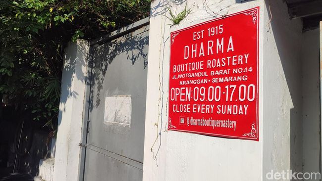 Di sana tertulis, 'EST 1915 Dharma Boutidue Roastery, Jalan Wotgandul Barat No 14, Open 09.00-17.00 WIB, Close Every Sunday'.
