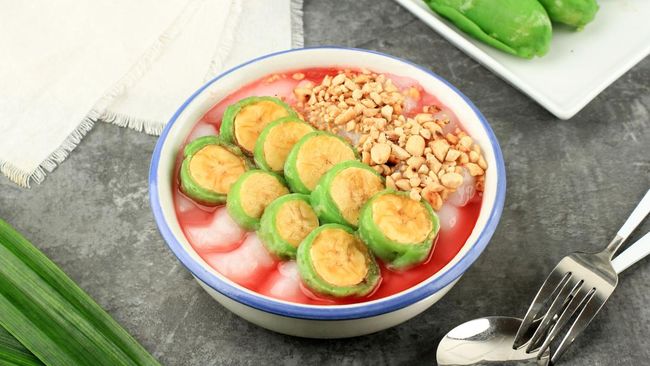 Kemudian dipotong-potong dan disajikan dengan bubur sumsum dengan tambahan sirup berwarna merah. Jangan lupa untuk menambahkan es batu agar semakin segar.