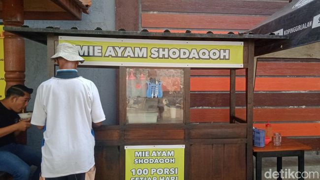 Jam baru menunjukkan pukul 08.30 WIB saat detikJateng melintas di depan gerobak mi ayam. Gerobak kayu bertuliskan Mi Ayam Shodaqoh itu berada di tepi jalan di utara Stadion Trikoyo.