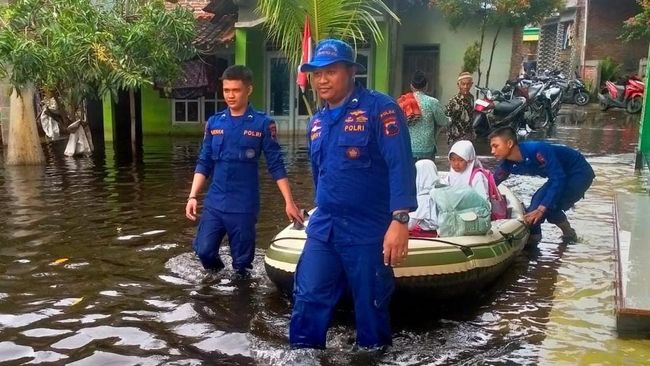 Banjir melanda Kecamatan Sayung, Kabupaten Demak, menyulitkan siswa pergi sekolah. Sebab itu, Direktorat Kepolisian Perairan dan Udara (Ditpolairud) Polda Jawa Tengah (Jateng) mengantar dan menjemput para siswa agar tetap bersekolah dengan menggunakan perahu karet dan truk polisi.