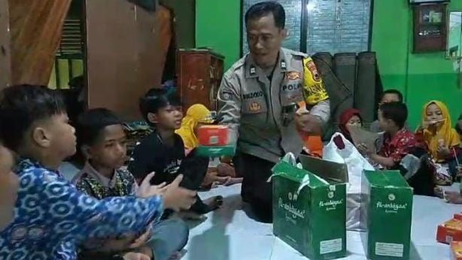 Seorang bhabinkamtibmas Kelurahan Pajang, Kecamatan Laweyan, Solo, Aiptu Slamet Widodo memberikan alat salat kepada anak-anak yatim piatu di Panti Asuhan Anak Yatim dan Terlantar Yayasan Nur Maghfiroh menjelang Iduladha 2025. Slamet membagikan alat salat guna memantik semangat anak yatim piatu.