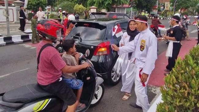 Satuan Lalu Lintas (Satlantas) Polres Sragen bersama Forum Komunikasi Perguruan Pencak Silat Sragen (FKPSS) membagikan bunga dan bendera Merah Putih kepada pengguna jalan di simpang empat Alun-alun Sragen. Hal itu dilakukan untuk menyemarakkan Hari Ulang Tahun (HUT) ke-80 Republik Indonesia.