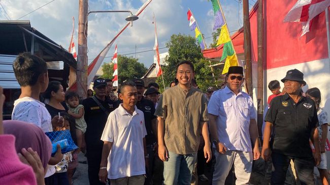Pantauan detikJateng di Cinderejo Kidul, Gilingan, Kecamatan Banjarsari, Solo, Minggu (18/8/2024), Gusti Bhre blusukan ditemani Ketua DPC Gerindra Solo Ardianto Kuswinarno, dan jajaran pengurus struktural DPC Gerindra yang menggenakan pakaian putih krem. Blusukan ini juga diikuti penampilan Barongsai.
