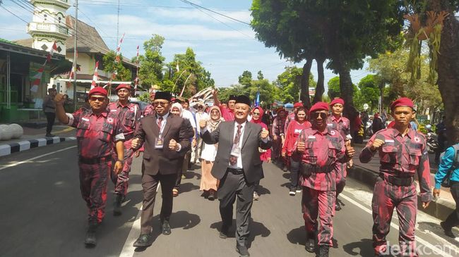 Pantauan detikJateng, Rabu (28/8/2024), Damar dan Sri Harso tampak kompak memakai jas warna hitam. Rombongan Damar dan Sri Harso terlihat berjalan kaki dengan dikawal Satgas PDIP dari parkiran Taman Kyai Langgeng hingga Kantor KPU Kota Magelang yang berjarak sekitar 1 km.