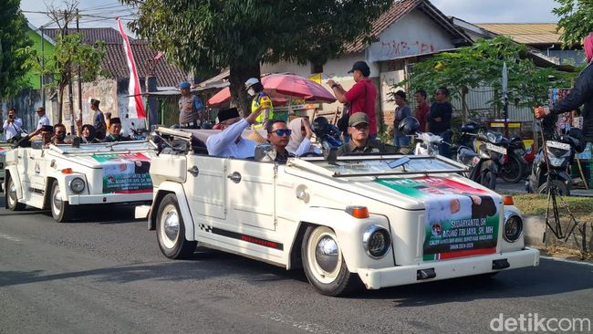 Bakal Calon Bupati-Wakil Bupati Magelang, Sudaryanto-Agung Trijaya (Satria), menaiki mobil Volkswagen (VW) saat mendaftar ke KPU Kabupaten Magelang. Mereka juga diantar oleh para pendukungnya dari Kantor DPC PKB menuju KPU.