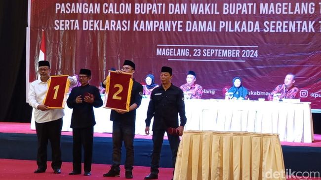 "Sesuai undian yang telah dilaksanakan maka urutan pasangan calon bupati dan wakil bupati Magelang tahun 2024 adalah sebagai berikut, nomor urut 1 adalah pasangan calon Bapak Sudaryanto dengan Bapak Agung Trijaya. Nomor urut 2 adalah pasangan calon Bapak Grengseng Pamuji dan Bapak Sahid," kata Ketua KPU Kabupaten Magelang, Ahmad Rofik, dalam rapat pleno terbuka yang berlangsung di Grand Artos Hotel Magelang, Senin (23/9/2024).