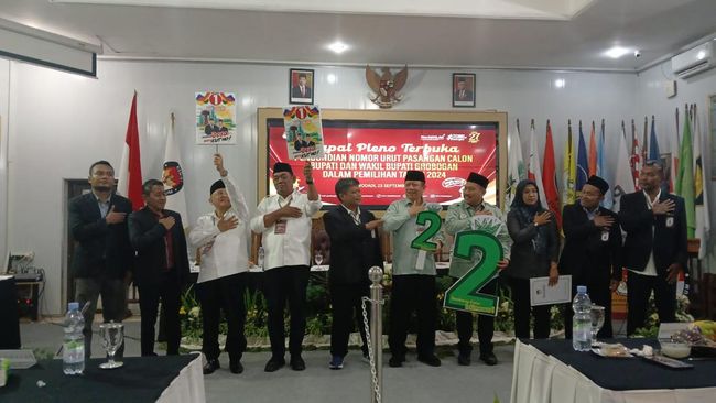 "Nomor urut pasangan calon Peserta Pemilihan Bupati-Wakil Bupati Grobogan. Nomor urut 1 paslon Setyo Hadi dan Sugeng Prasetyo. Partai pengusul PDI-P, Gerindra, Hanura, PPP, PKS, Golkar, Demokrat, Nasdem, PSI. Nomor urut 2 Bambang Pujiyanto dan Catur Sugeng Prasetyo. Parpol pengusul PKB, Gelora, Partai Buruh," kata Agung Sutopo di kantornya, Senin (23/9/2024).