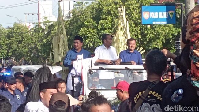 Presiden ke-7 RI Joko Widodo (Jokowi) mendampingi Cagub Ahmad Luthfi dan Cawagub Taj Yasin kampanye di Blora. Ketiganya naik mobil bak terbuka untuk menyapa warga dan membagikan kaus ke warga.