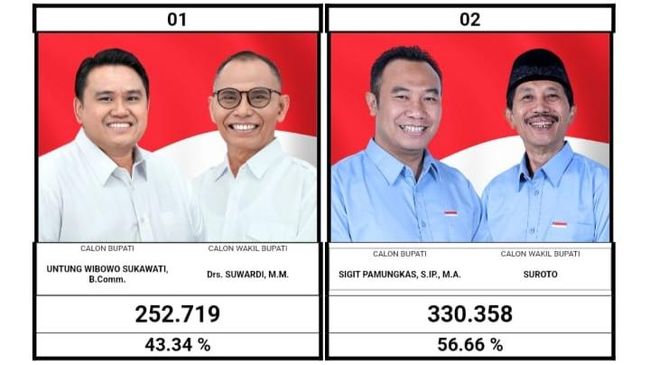 Dari data rekapitulasi Pemkab Sragen, pasangan Sigit-Suroto menang di total 20 kecamatan di Kabupaten Sragen.