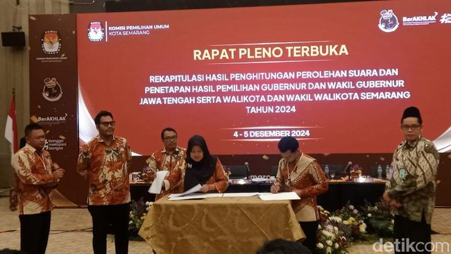 Komisi Pemilihan Umum (KPU) Kota Semarang telah menyelesaikan rapat pleno rekapitulasi hasil Pemilihan Gubernur (Pilgub) Jateng dan Pemilihan Wali Kota (Pilwalkot) Semarang 2024. Hasilnya paslon yang diusung PDIP unggul, yakni Andika Perkasa-Hendrar Prihadi dan Agustina Wilujeng-Iswar Aminuddin.
