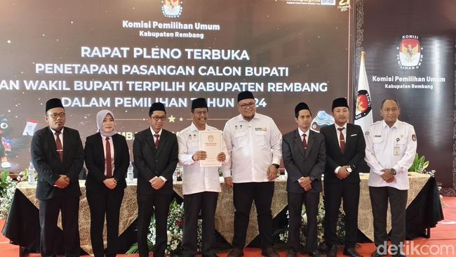 Komisi Pemilihan Umum (KPU) Kabupaten Rembang secara resmi menetapkan pasangan Harno dan M Hanies Cholil Barro' (Harno-Gus Hanies) sebagai pemenang Pilkada Rembang 2024. Pasangan nomor urut dua itu resmi menjadi Bupati dan Wakil Bupati (Wabup) terpilih Kabupaten Rembang hasil Pilkada 2024.
