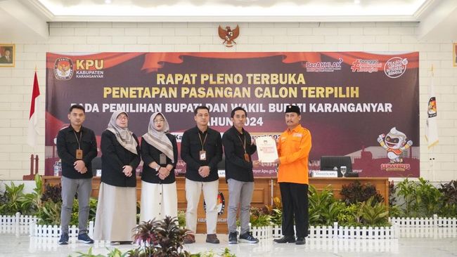 KPU Karanganyar menggelar penetapan pasangan calon terpilih Pilkada Kabupaten Karanganyar 2024. Baik paslon terpilih maupun rivalnya di Pilkada Karanganyar 2024 tidak hadir.