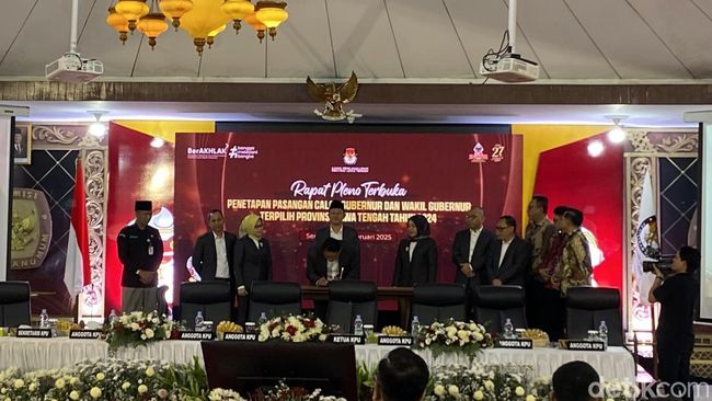 "Perlu kami sampaikan bahwa pasangan calon gubernur dan wakil gubernur telah kami sampaikan undangan untuk dapat mengikuti rapat pleno terbuka ini. Karena sesuatu dan lain hal, (Luthfi-Yasin) tidak dapat hadiri acara di malam hari ini. Namun demikian rapat pleno tetap sah dan dapat dilanjutkan," kata Handi di Kantor KPU Jateng, Rabu (5/2/2025).