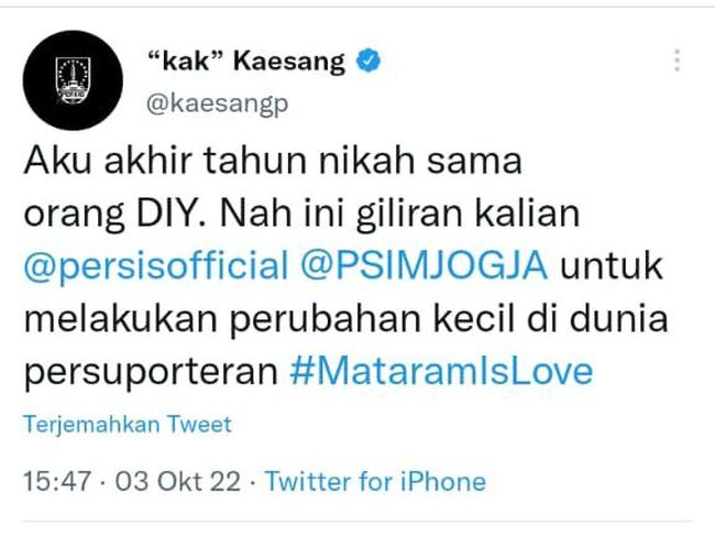 "Aku akhir tahun nikah sama orang DIY. Nah ini giliran kalian @persisofficial @PSIMJOGJA untuk melakukan perubahan kecil di dunia persuporteran #MataramIsLove," tulis Kaesang dikutip detikJateng.