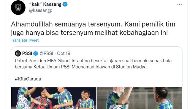 Dalam cuitannya itu Kaesang juga me-repost akun PSSI yang menampilkan potret kebersamaan Presiden FIFA dengan Ketum PSSI. Dalam foto-foto yang dibagikan PSSI itu juga disertai keterangan permainan bola itu digelar di Stadion Madya.