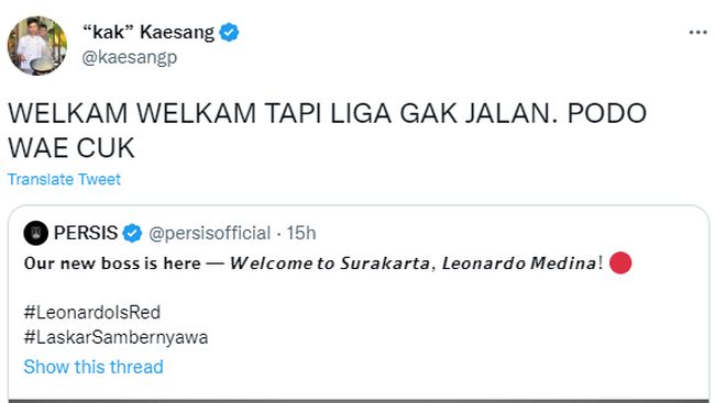 Cuitan Kaesang itu menyertakan akun Twitter Persis Solo yang mengunggah video ucapan selamat atas bergabungnya Leonardo Medina. Dalam keterangan @persisofficial itu, mereka menyambut Leonardo Medina sebagai bos baru.