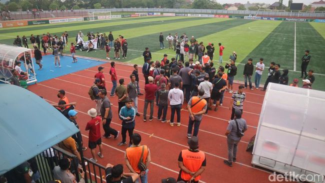 Suporter Persipa Pati, Jawa Tengah, sempat turun ke lapangan usai timnya kalah di kandang sendiri saat menjamu Gresik United dalam lanjutan Liga 2 2023/2023. Persipa kalah 0-1 yang membuatnya berada di dasar klasemen sementara.