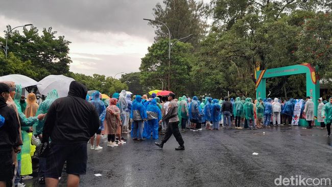 Dengan mengenakan jas hujan dan juga payung, mereka rapi berurutan untuk mengantre. Antrean panjang para penonton sudah terlihat sejak pukul 16.30 WIB padahal gate baru dibuka pukul 17.00 WIB.