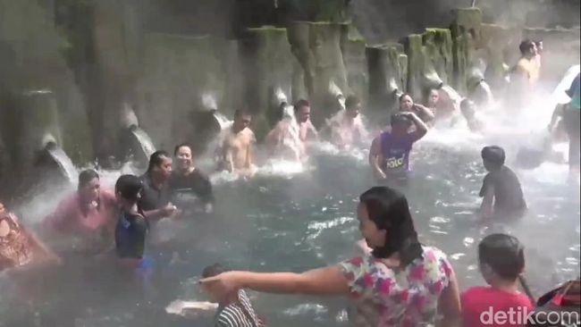 Kepadatan juga terjadi di dalam objek wisata. Pemandian air panas pancuran 13 guci tampak para wisatawan membludak berendam air panas alami. Kolam air panas ini memang memiliki daya tarik tersendiri, sehingga para wisatawan banyak menyempatkan diri untuk berendam.