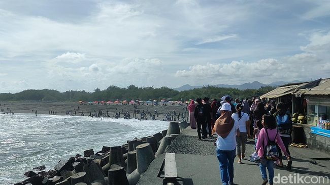 Berdasarkan pengamatan detikJateng, terjadi penumpukan wisatawan di jalur masuk menuju kawasan pemecah ombak Pantai Glagah, sore ini. Kepadatan baru terpecah saat memasuki area pantai.