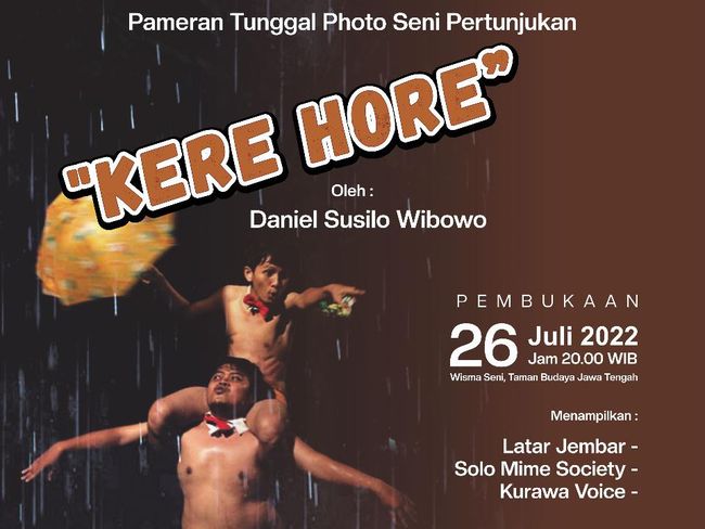 Malam pembukaan pameran foto "KERE HORE" ini akan dimeriahkan oleh penampilan Latar Jembar, Solo Mime Society, dan Kurawa Voice. Adapun pameran tunggal foto seni pertunjukan karya Daniel Susilo Wibowo ini bisa dinikmati sejak Selasa malam hingga Sabtu (30/7) mendatang di Wisma Seni TBJT.