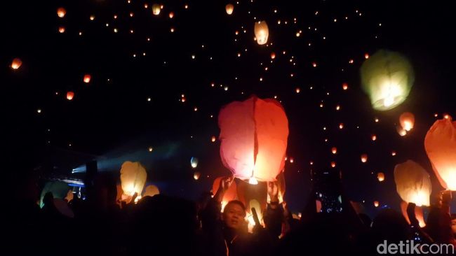 Ribuan lampion menghiasi langit dataran tinggi Dieng malam tadi. Kerlap-kerlip ribuan lampion ini seakan mengobati kerinduan wisatawan setelah pesta lampion tak digelar dua tahun karena pandemi COVID-19.