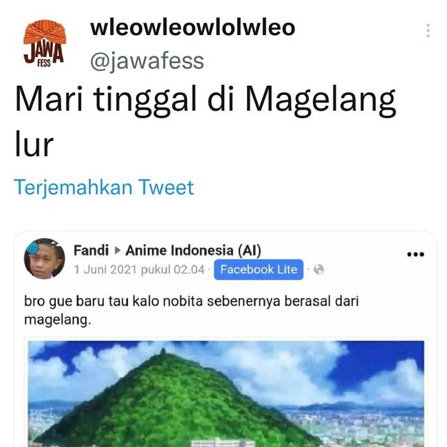 Tampak foto Bukit Doraemon di bagian atas dan di bawahnya gunung di Magelang. "Bro gue baru tau kalo nobita sebenernya berasal dari magelang," tulis pengunggah foto itu ke akun Anime Indonesia yang di-retweet Jawafess.