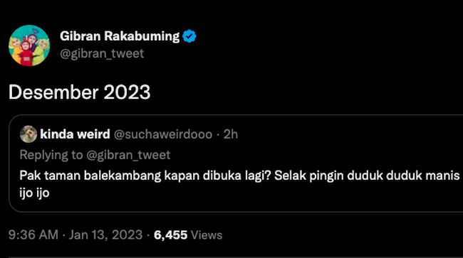 Ditutupnya Taman Balekambang karena adanya revitalisasi membuat warga rindu dengan suasananya. Tidak sedikit yang bertanya-tanya kapan taman tersebut kembali dibuka. Seorang netizen pun menanyakan hal tersebut kepada Wali Kota Solo Gibran Rakabuming Raka.