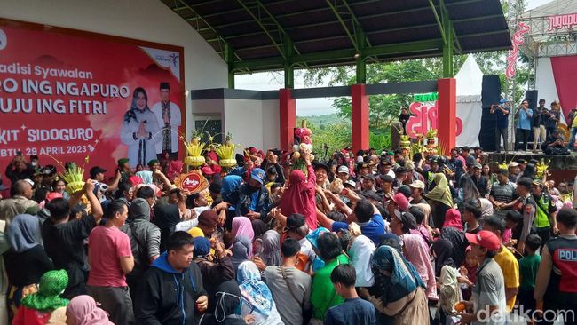 Warga lainnya pun langsung menyerbu gunungan di lokasi lain di samping panggung. Berdesakan dan bersenggolan tak terhindarkan sehingga polisi, TNI, dan Satpol PP harus bekerja keras mengendalikan.