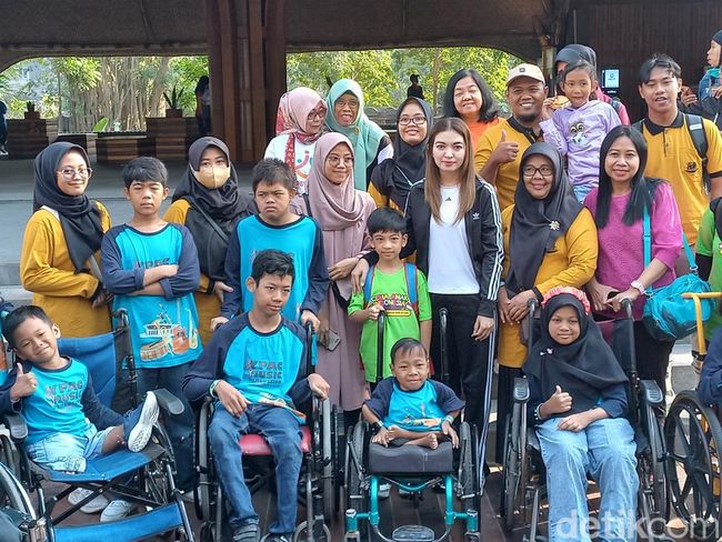 Selfi dan Jan Ethes sempat berfoto bersama dengan siswa SLB D YPAC Solo yang usai tampil di panggung. Sebanyak 11 siswa SLB D YPAC Solo itu membawakan dua lagu di hadapan sedikitnya 1.500 anak peserta Senam dan Pentas Ceria Anak Indonesia.