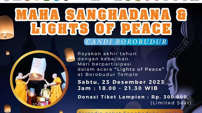 Acara yang bertajuk 'Maha Sanghadana dan Lights Of Peace' Candi Borobudur. Penerbangan lampion akan dilangsungkan, Sabtu (23/12/2023), pukul 18.00-21.30 WIB. Untuk donasi tiket lampion Rp 300 ribu.