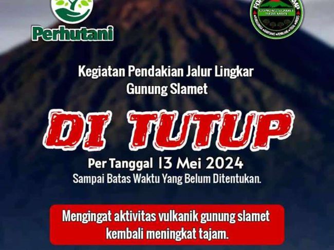 Jalur pendakian Gunung Slamet, Jawa Tengah, ditutup hingga batas waktu yang belum ditentukan. Ada cerita 329 orang pendaki yang terlanjur mendaki saat pengumuman jalur pendakian ditutup.