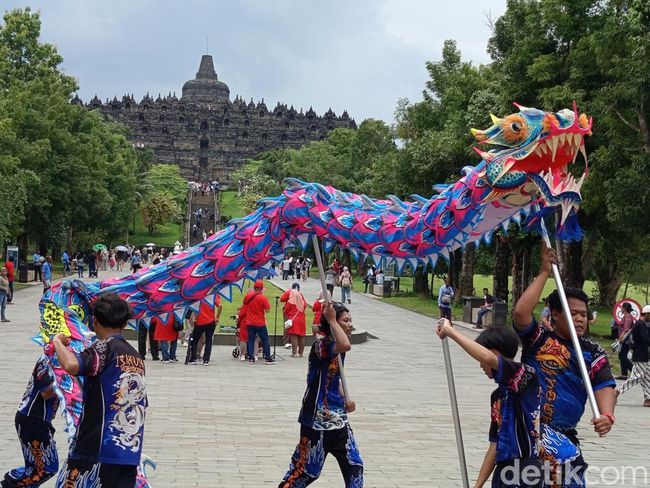 Ada atraksi barongsai dan liong di Candi Borobudur, Kabupaten Magelang, Jawa Tengah, pada libur Imlek 2576/2025.