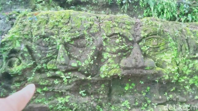 Pahatan tersebut lebih menyerupai topeng kepala dengan ukuran tinggi dan lebar sekitar 1 meter. Wisatawan yang melintas di depannya tidak menyadari ada pahatan tersebut karena batunya telah berlumut sebagian.