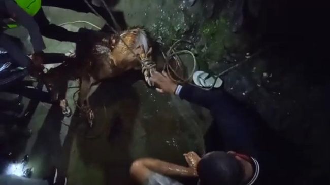 Penyelamatan seekor rusa yang terjebak di gorong-gorong Desa Padusan, Pacet, Mojokerto berlangsung dramatis. Rusa jantan itu bisa dievakuasi dari saluran air yang sempit setelah relawan menjerat kakinya dengan tali karmantel.
