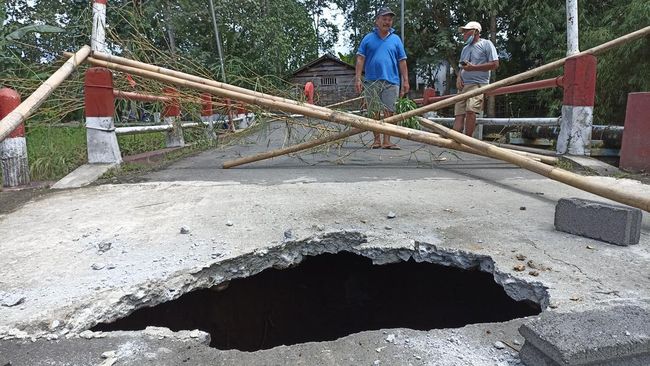 "Kalau sekarang tidak bisa dilihat, titik yang tergerus ini kemungkinan berada di bagian paling bawah. Saat awal kejadian tadi ada mobil yang ban-nya masuk ke lubang ini," ujarnya.