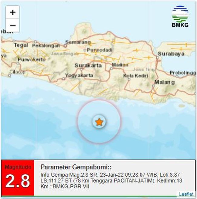 Gempa bumi M 2.8 guncang Pacitan. Gempa Pacitan ini terjadi 09:28:07 WIB, Minggu (23/1/2022).