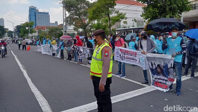 Ratusan pengungsi dari Afghanistan menggelar demo di depan kantor DPRD Kota Surabaya Jalan Yos Sudarso. Mereka minta kejelasan nasib.