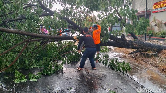 Hujan deras disertai angin kencang di Lamongan membuat 2 pohon tumbang. Tidak ada korban dalam kejadian ini.
