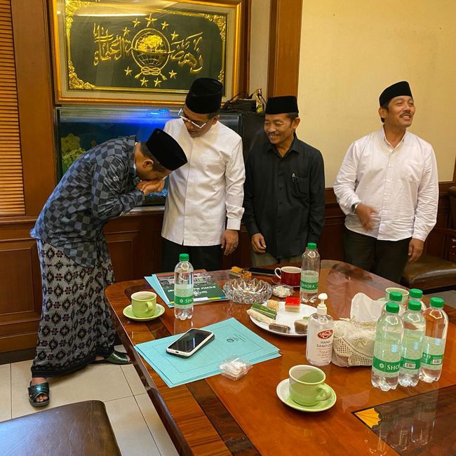 Gus Makki hadir dengan mengenakan sarung pemberian Rais Syuriyah PWNU Jawa Timur, KH.Anwar Manshur. Nampak Gus Makki juga mencium tangan Ketua Umum PBNU KH Yahya Cholil Staquf di kantor PBNU, Rabu (26/1/2022).