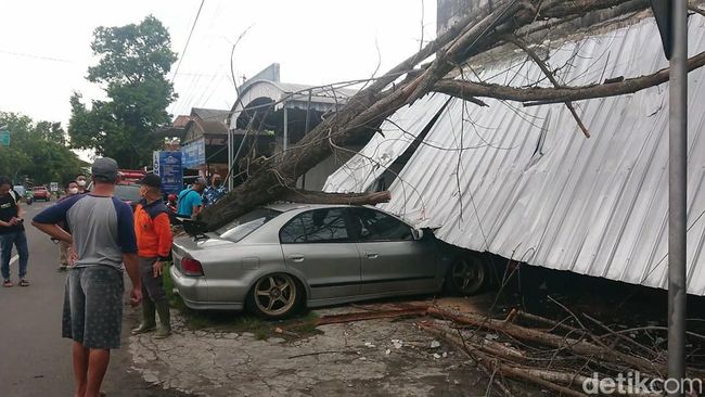 Pohon yang telah kering dan mati tersebut tepat menimpa atap teras bengkel, sedangkan bagian yang lain menimpa mobil Mitsubishi Galant yang terparkir di depan bengkel. Ambruknya teras bengkel tersebut juga menimpa bagian kaca depan mobil hingga pecah.