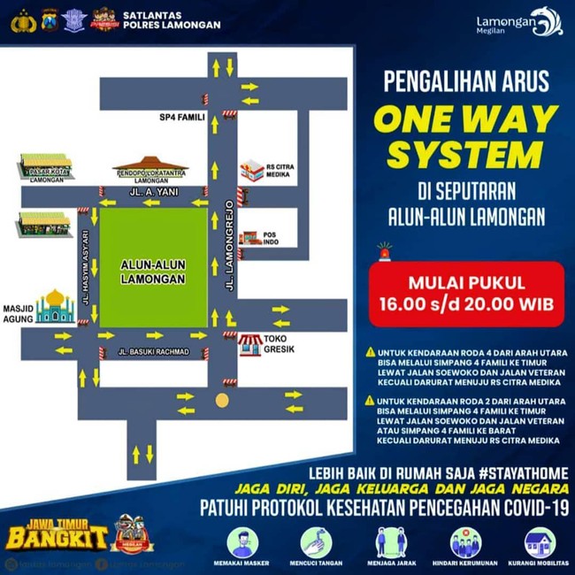 Pandemi COVID-19 masih berlangsung. Untuk meminimalisir mobilitas masyarakat, jalan di seputar Alun-alun Lamongan akan diberlakukan satu arah atau one way. Penerapan one way system ini digelar setiap hari.