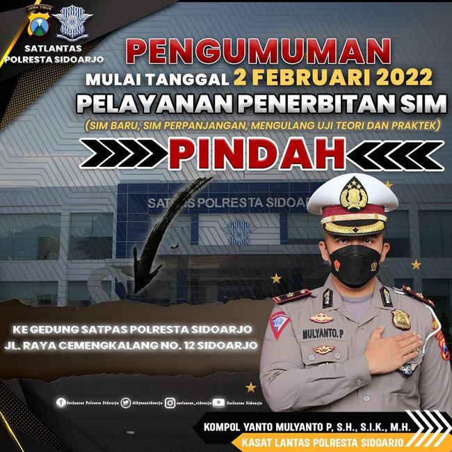 Lokasi baru pelayanan penerbitan SIM pindah ke Satuan Penyelenggara Administrasi SIM (Satpas) Polresta Sidoarjo di Jalan Cemengkalang nomor 12 Sidoarjo. Lokasi ini berdekatan dengan Polresta Sidoarjo.